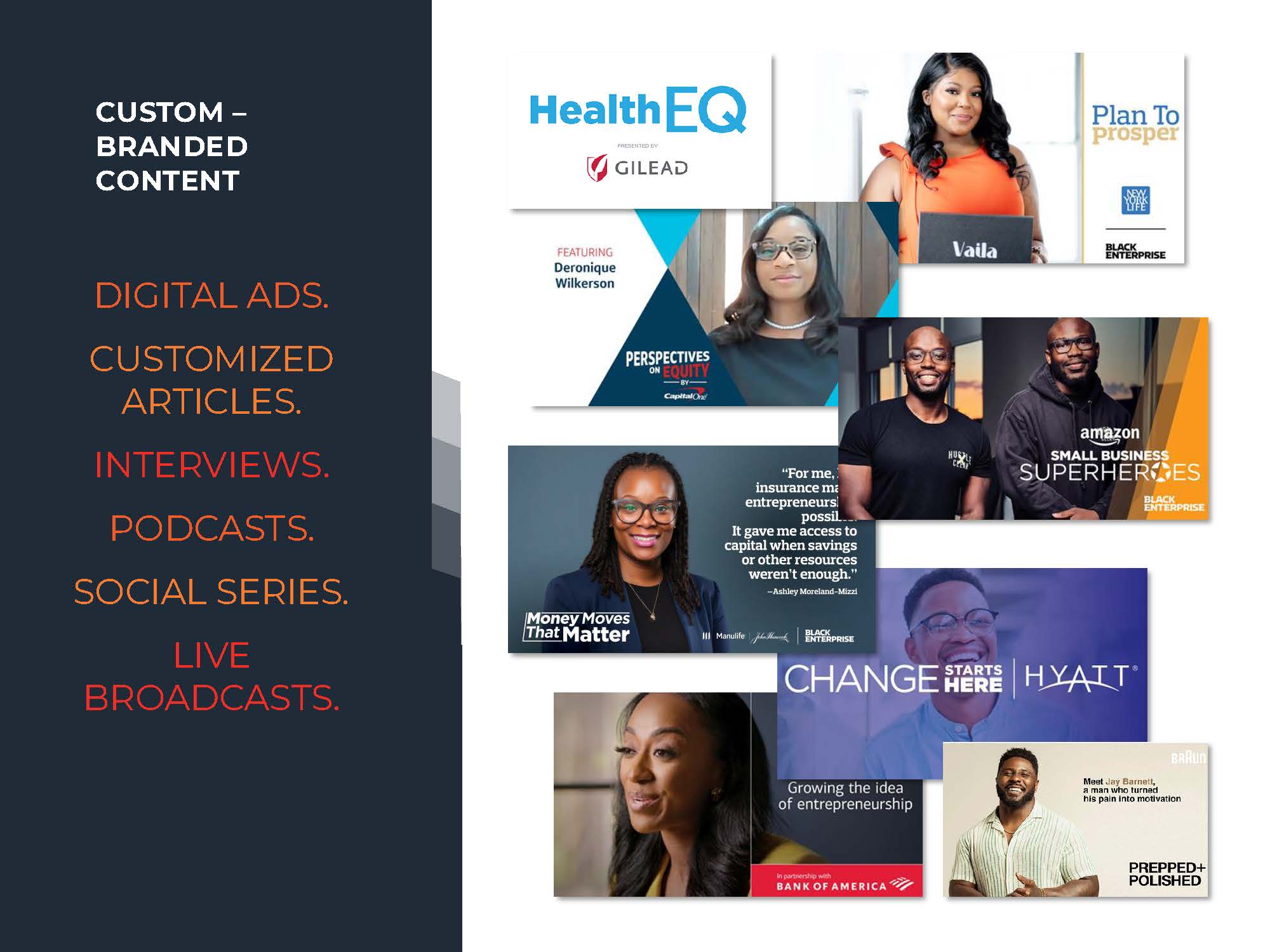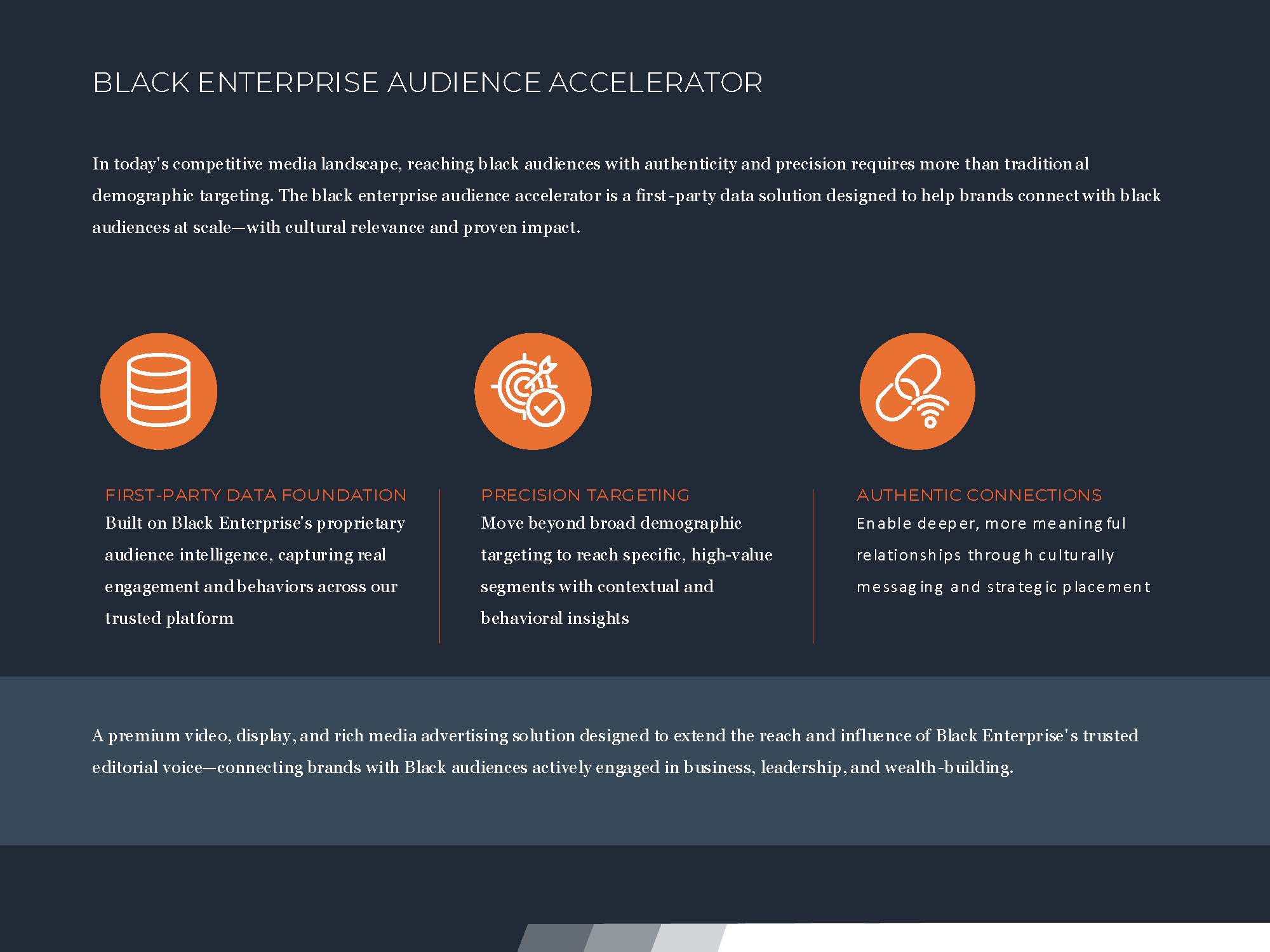 A premium video, display, and rich media advertising solution designed to extend the reach and influence of Black Enterprise’ s trusted editorial voice—connecting brands with Black audiences actively engaged in business, leadership, and wealth -building.